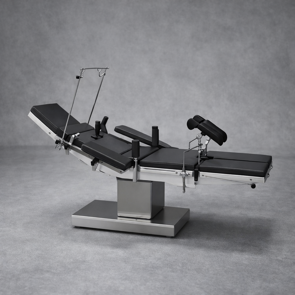 Современный операционный стол с регулируемыми секциями и высокой стабильностью, обеспечивающий точное позиционирование пациента и удобство работы хирургов при различных видах операций.